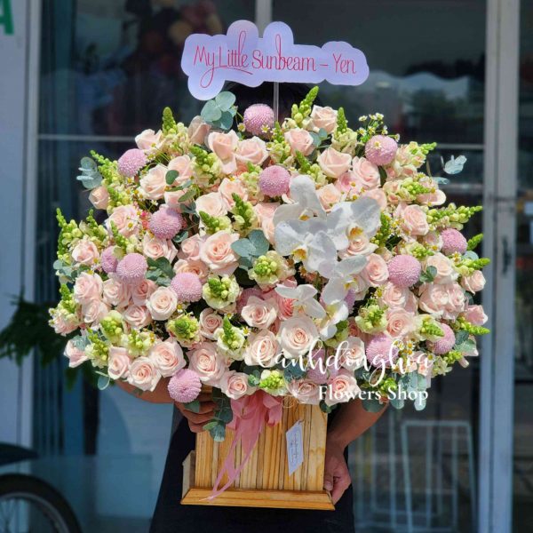 Giỏ hoa với tone màu hồng nhẹ nhàng, lãng mạn, nữ tính và ngọt ngào.