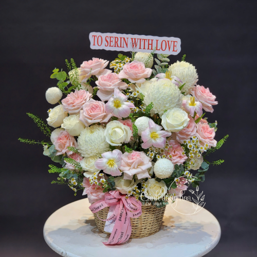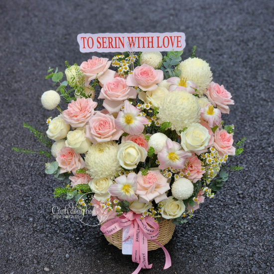 Giỏ hoa mang vẻ đẹp nhẹ nhàng và tinh tế, như một khoảng lặng êm đềm giữa nhịp sống bận rộn. Những đóa hoa được phối màu hài hòa, mềm mại, tạo cảm giác thư thái và dễ chịu ngay từ ánh nhìn đầu tiên.