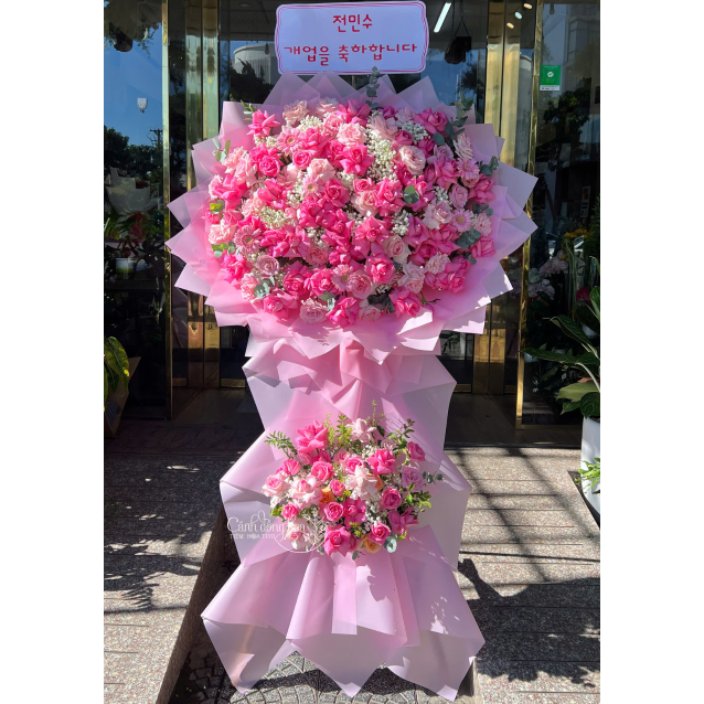 Sắc hồng ngọt ngào kết hợp thiết kế tinh tế tạo nên kệ hoa khai trương sang trọng, thay lời chúc một hành trình kinh doanh đầy may mắn và thành công.