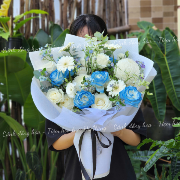 Bó hoa này mang đến sắc xanh tươi mát như làn sóng vỗ về bờ cát, hòa quyện giữa những bông hoa xanh biển và trắng tinh khôi, tạo nên một bức tranh thiên nhiên sống động. Những cánh hoa mềm mại như làn gió biển, nhẹ nhàng thoảng qua, gợi nhớ đến những buổi chiều lộng gió bên bãi biển.