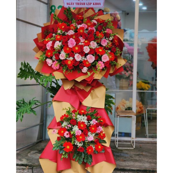 Kệ hoa khai trương hoa hồng mix hoa đồng tiền đỏ