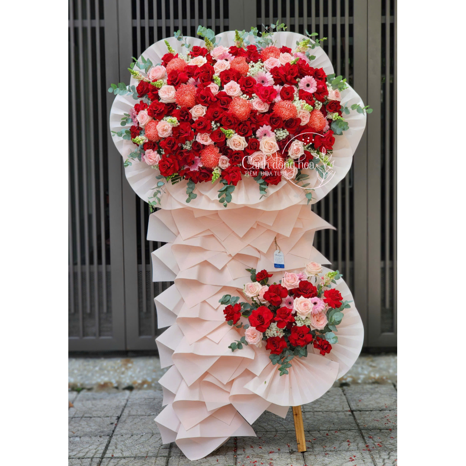 Kệ hoa mang sắc thái rực rỡ và trang trọng, được thiết kế như một lời chúc cát tường gửi đến ngày khai trương trọng đại. Với sự kết hợp hài hòa giữa hoa hồng đỏ, đồng tiền, cúc mẫu đơn và các loại hoa điểm, kệ hoa không chỉ nổi bật mà còn mang ý nghĩa chúc doanh nghiệp phát tài, công việc suôn sẻ, mọi điều như ý.