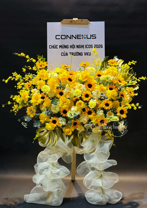 Kệ hoa được thiết kế chỉn chu, kết hợp những đóa hoa vàng tươi sáng, thay lời chúc khai trương hồng phát – làm ăn phát đạt – vạn sự như ý gửi đến gia chủ trong ngày mở cửa đón lộc.