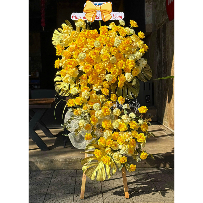 Kệ hoa khai trương tông vàng sang trọng với sắc hoa rực rỡ như ánh kim, tượng trưng cho phú quý và thịnh vượng. Thiết kế nổi bật giúp không gian khai trương thêm đẳng cấp và ấn tượng.